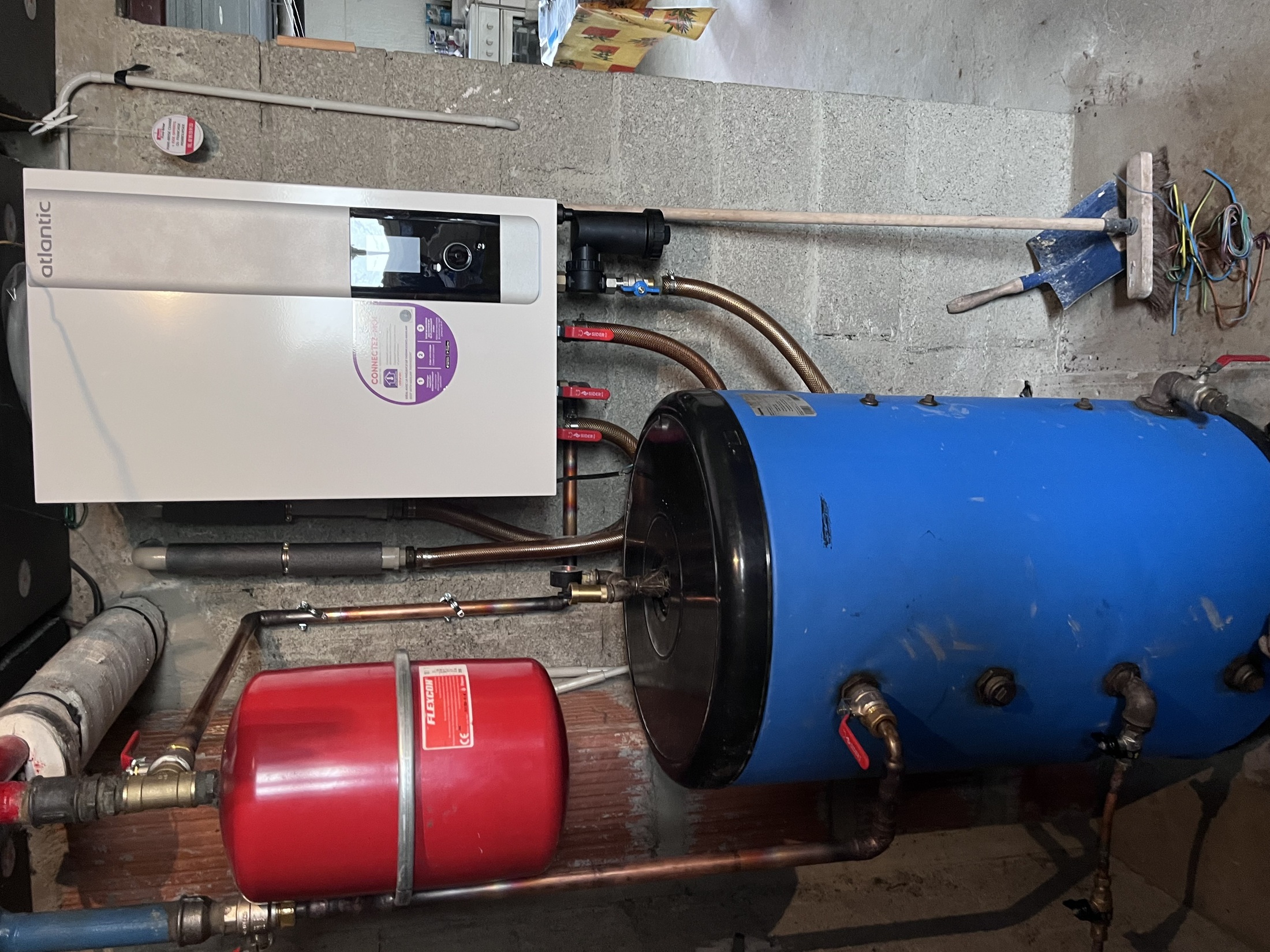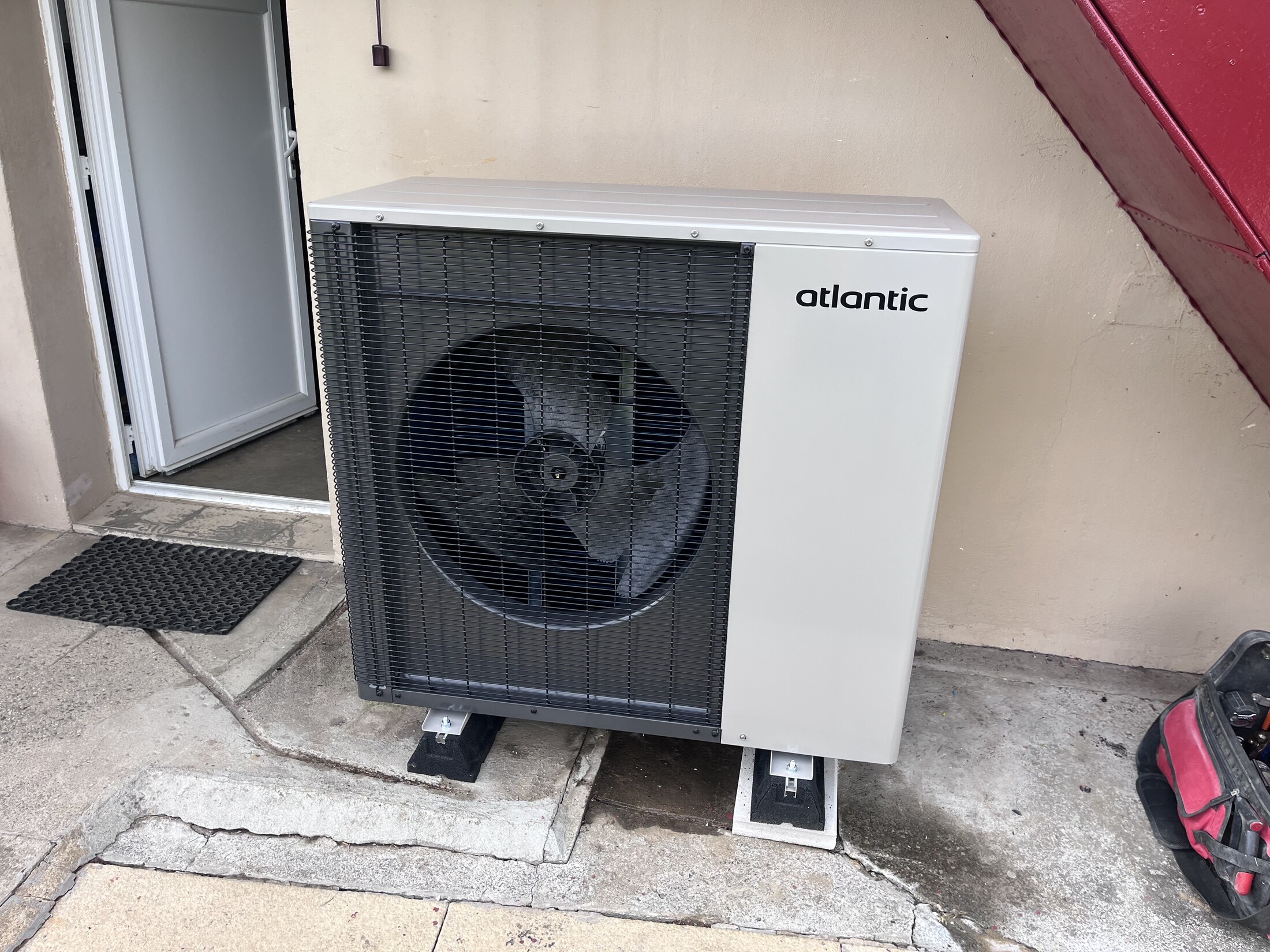 Intervention de notre équipe pour le remplacement d’un ancien système de chauffage par une nouvelle pompe à chaleur aérothermique Atlantic, composée d’un module extérieur et d’un module intérieur hydraulique.
